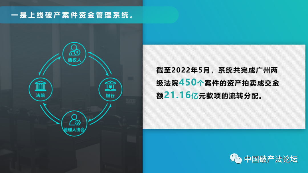 一是案件审理功能。全流程线上办案、在线会议、在线表决、文书交互、在线审阅、在线批复,截至2022年5月,免费召开网络债权人会议共计215场。
