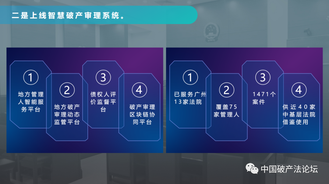 智慧破产审理系统-全流程线上办理智慧破产审理系统实现了审判队伍、管理人、债权人全域全流程的线上办理。截至2022年5月,智慧破产审理系统服务广州13家法院、覆盖75家破产管理人、办理的案件已达1471件,另有近40家法院借鉴使用该系统。